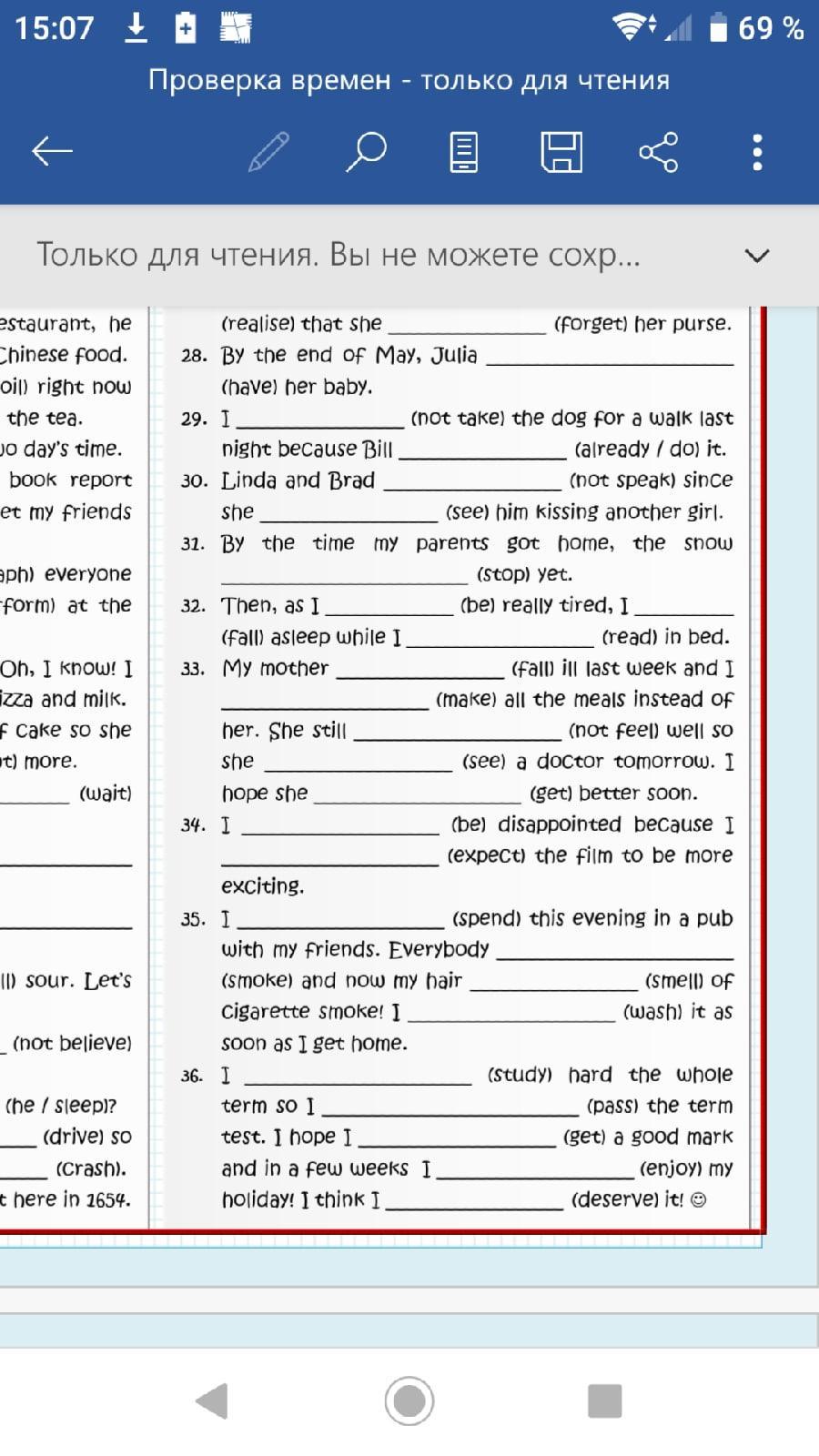 35. have spent, has been smoking, is smelling, will wash