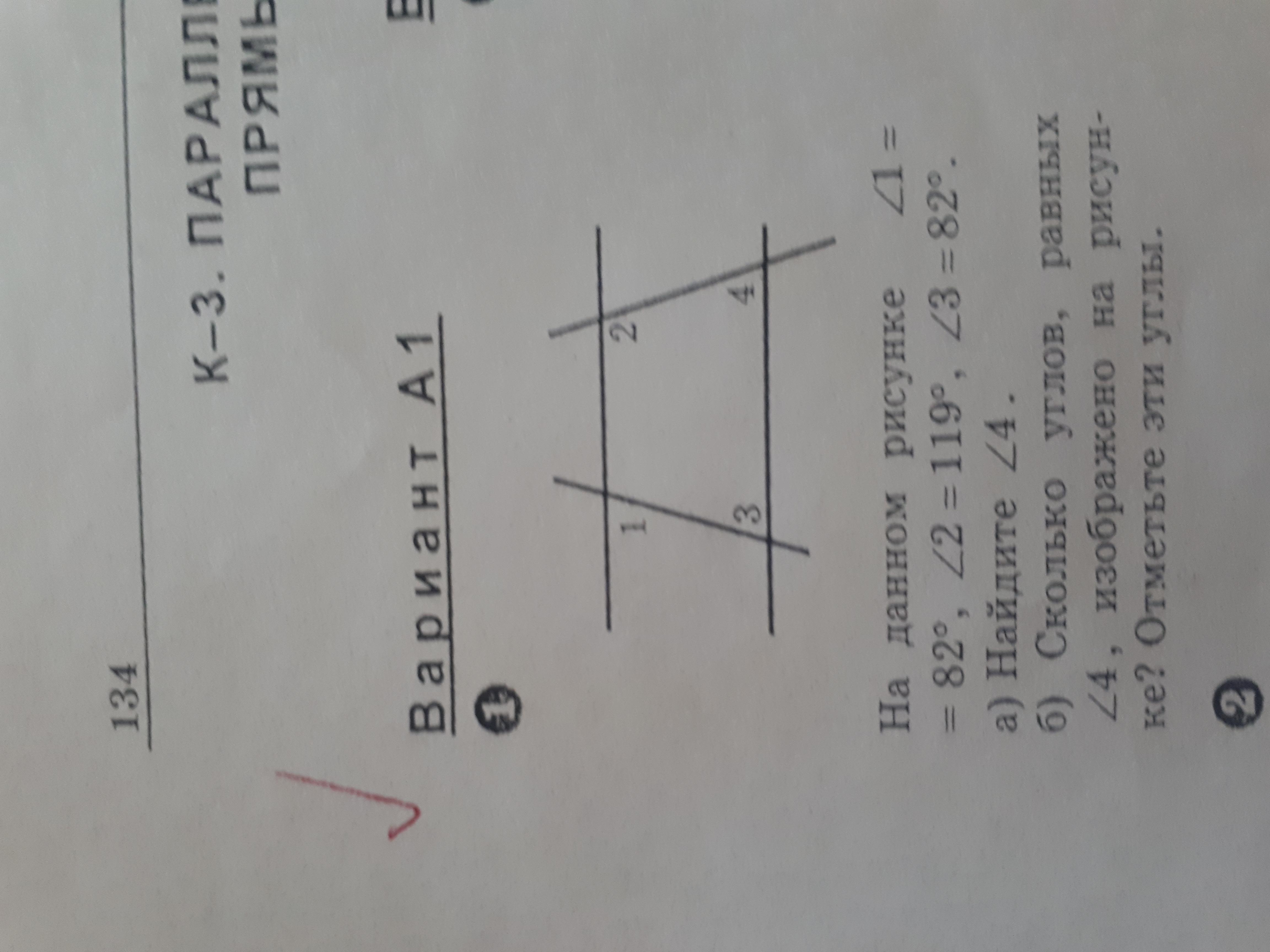 Тк углы 1 и 3 раны то они накрест лежащие при параллельных прямых, след угол 4+угол2=180 как внутренние односторонние при параллельных прямых следует угол 4 =180-119=61 градус