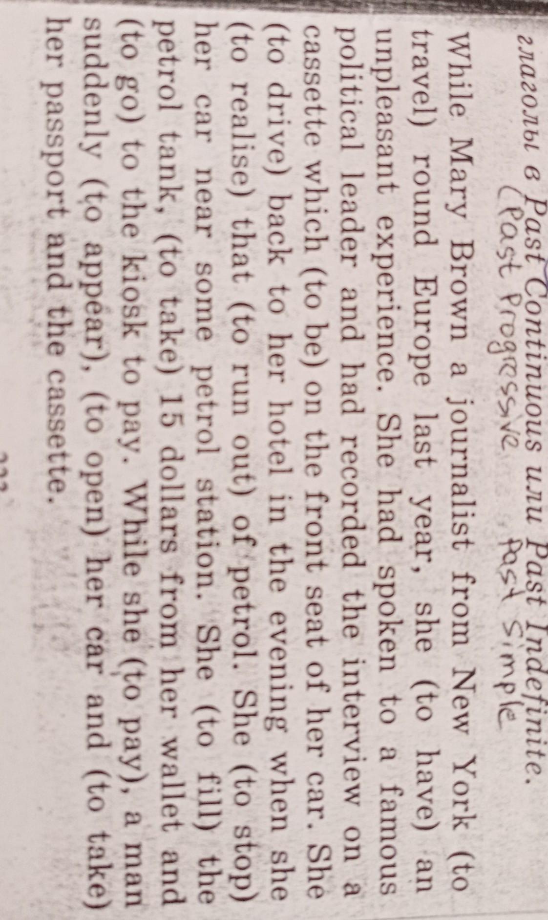 While Mary Brown a journalist from New York was travelling round Europe last year, she had an unpleasent expirience. She had spoken to a famous political leader and had recorded the interview on a cassette which was on the front seat of her car. She was driving back to her hotel in the evening when she realised that ran out of petrol. She stopped her car near some petrol station. She filled the petrol tank, took 15 dollars from her wallet and went to the kiosk to pay. While she was paying , a man suddenly appeared , opened her car and took her passport and the cassette.