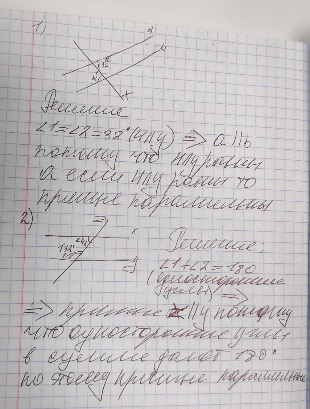 угол 1 (32 градуса) и угол 2 (32 градуса. они накрест лежащие углы следовательно, a паралельно b.
