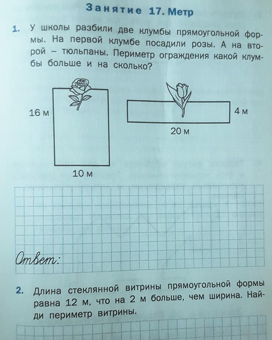 1. Периметр ограждения клумбы с розами (16+10)*2=26*2=52/м/, а с тюльпанами (20+4)*2=24*2=48/м/
