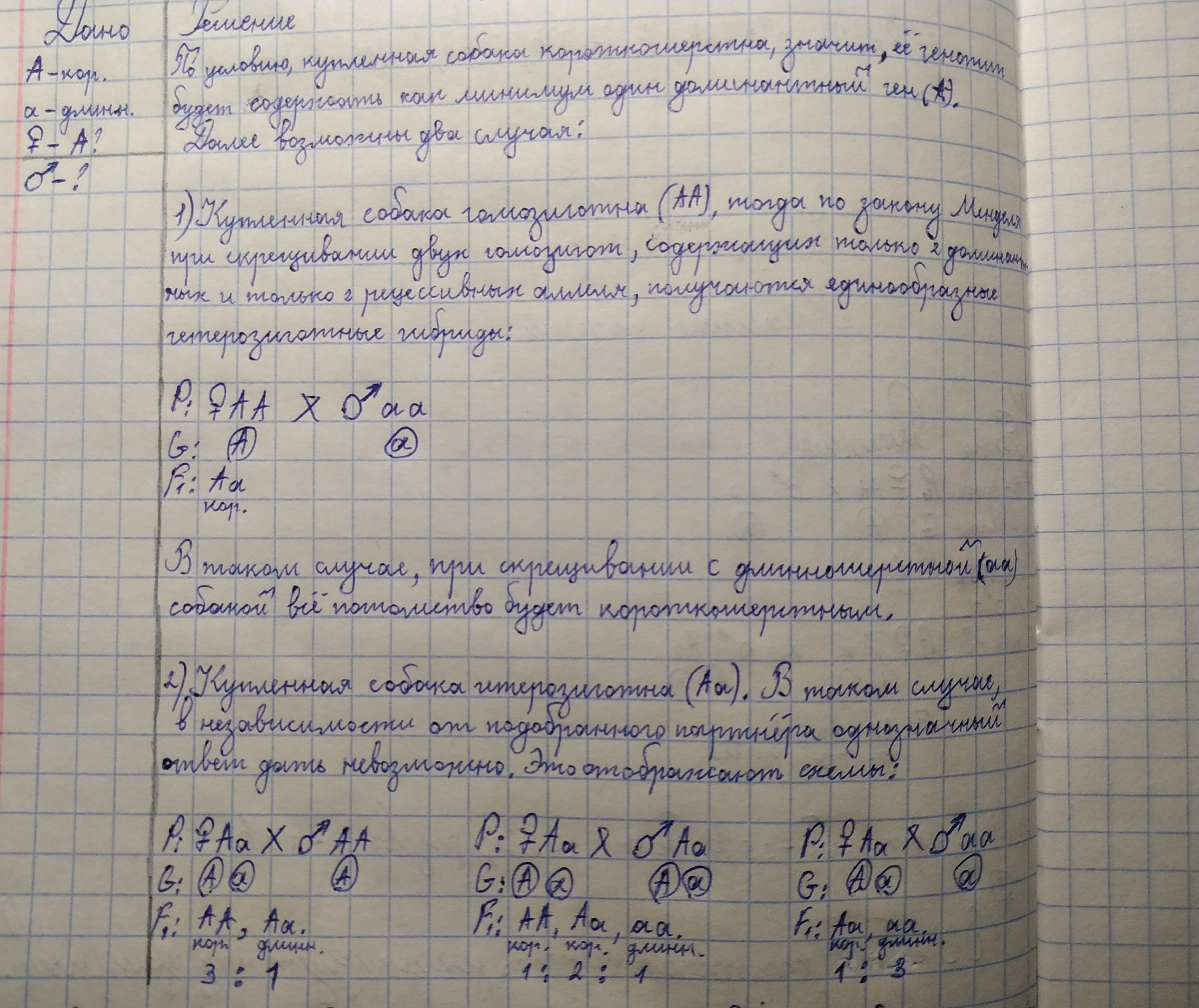 Ответ:1)Если собака гомозиготна, необходимо взять для скрещивания длинношерстную собаку с генотипом аа;