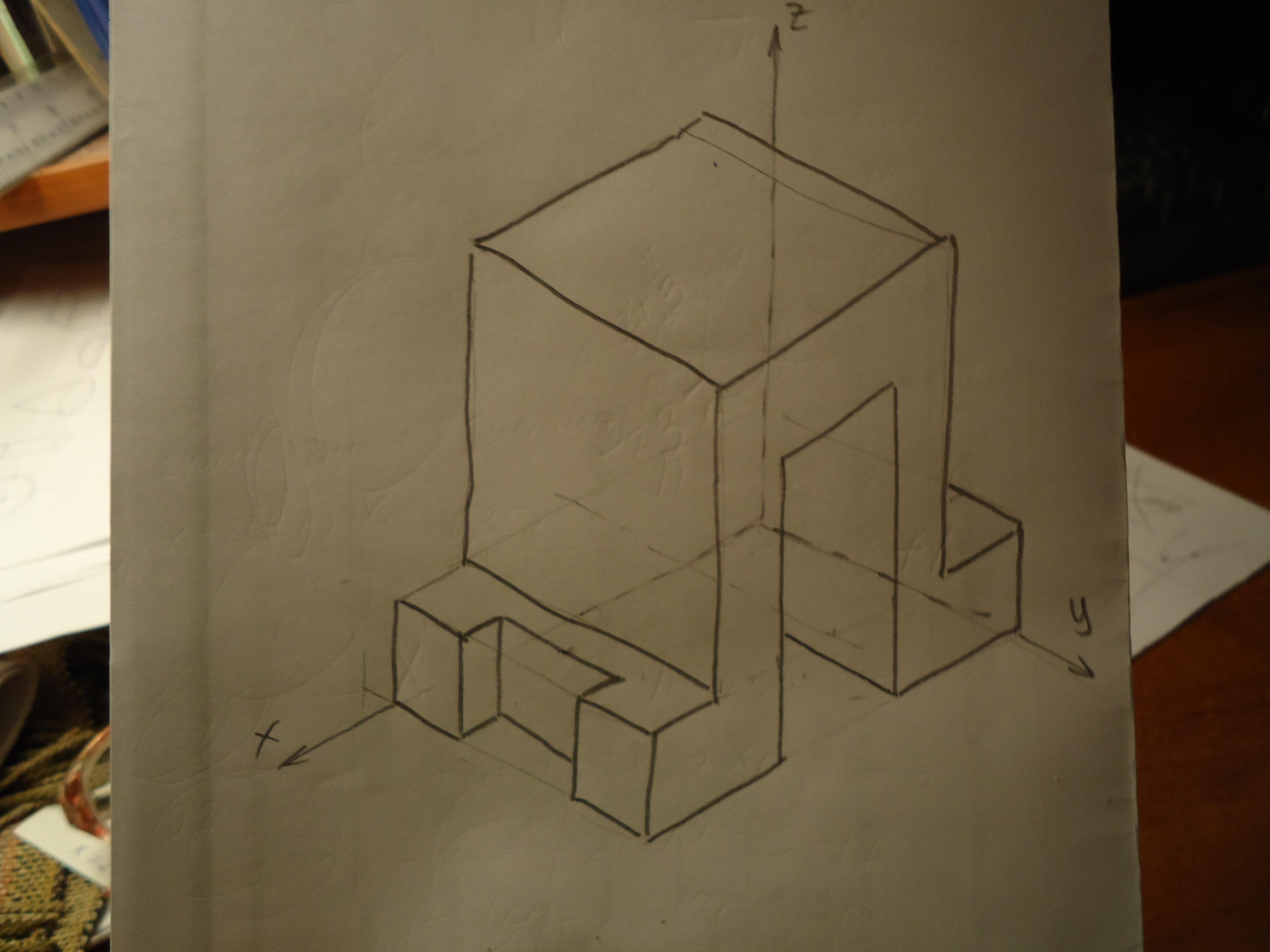Изометрию легче строить , начиная с построения вида спереди в плоскости хz, а затем начать удаляться из всех углов изображени параллельно оси у на ширину детали. Желаю успехов.