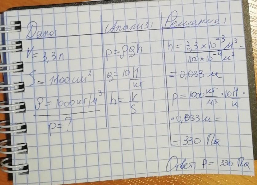 На сколько увеличится давление кастрюли на стол, если налить в нее 3.3 л воды? Площадь дна кастрюли 1100 см². Плотность воды — 1000 кг/м³. Ответ выразите в паскалях.