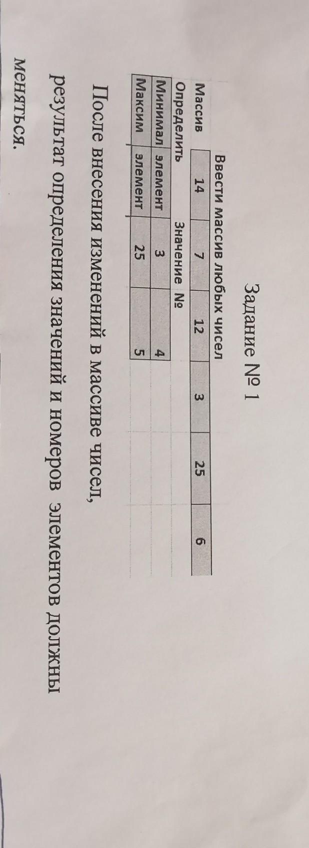 {$CODEPAGE UTF8} program Minimal; const arrayLength = 10; var inputArray : array [1..arrayLength] of integer; minimum, i: integer; begin randomize; writeln ('Исходный массив: '); {заполнение случайными числами} for i := 1 to arrayLength do begin inputArray[i] := random(100); write (inputArray[i]:4); end; writeln; {поиск минимального значения} {считаем что первый элемент и есть минимальный} minimum := inputArray[1]; for i := 2 to arrayLength do if minimum > inputArray[i] then {если минимум больше текущего} minimum := inputArray[i]; {присваиваем ему текущее значение} write('Минимальный элемент массива ', minimum); readln; end.
