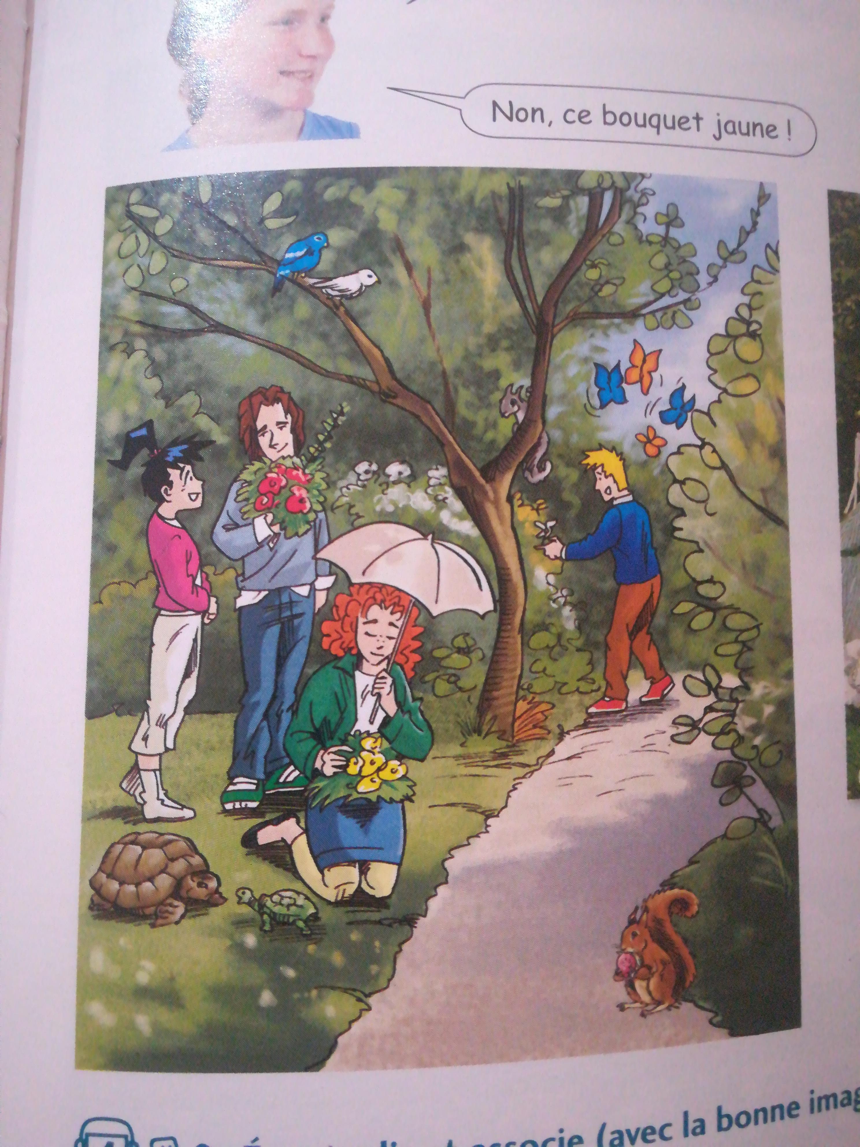 à l'arrière plan se trouve un arbre où des oiseaux sont assis et un écureuil rampe. Aussi il y a un garçon au dessus de qui volent des papillons.Sur le plan principal, nous voyons un couple amoureux.Nous voyons aussi une femme triste qui est à genoux, peut être elle regarde deux tortues