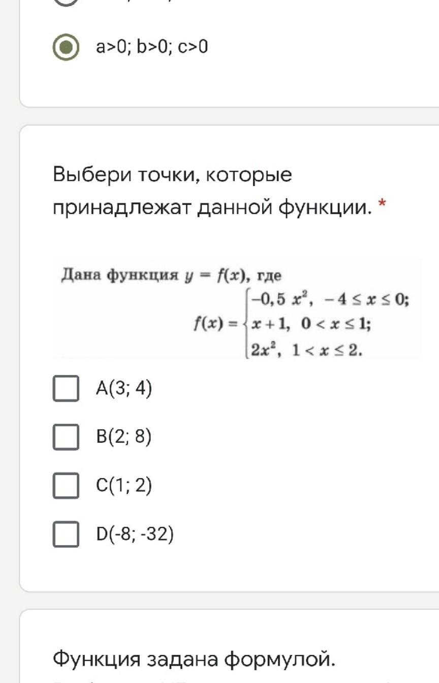 B)x=2; y=8: 8=2*2^2; 8=8. Эта точка принадлежит данной функции.