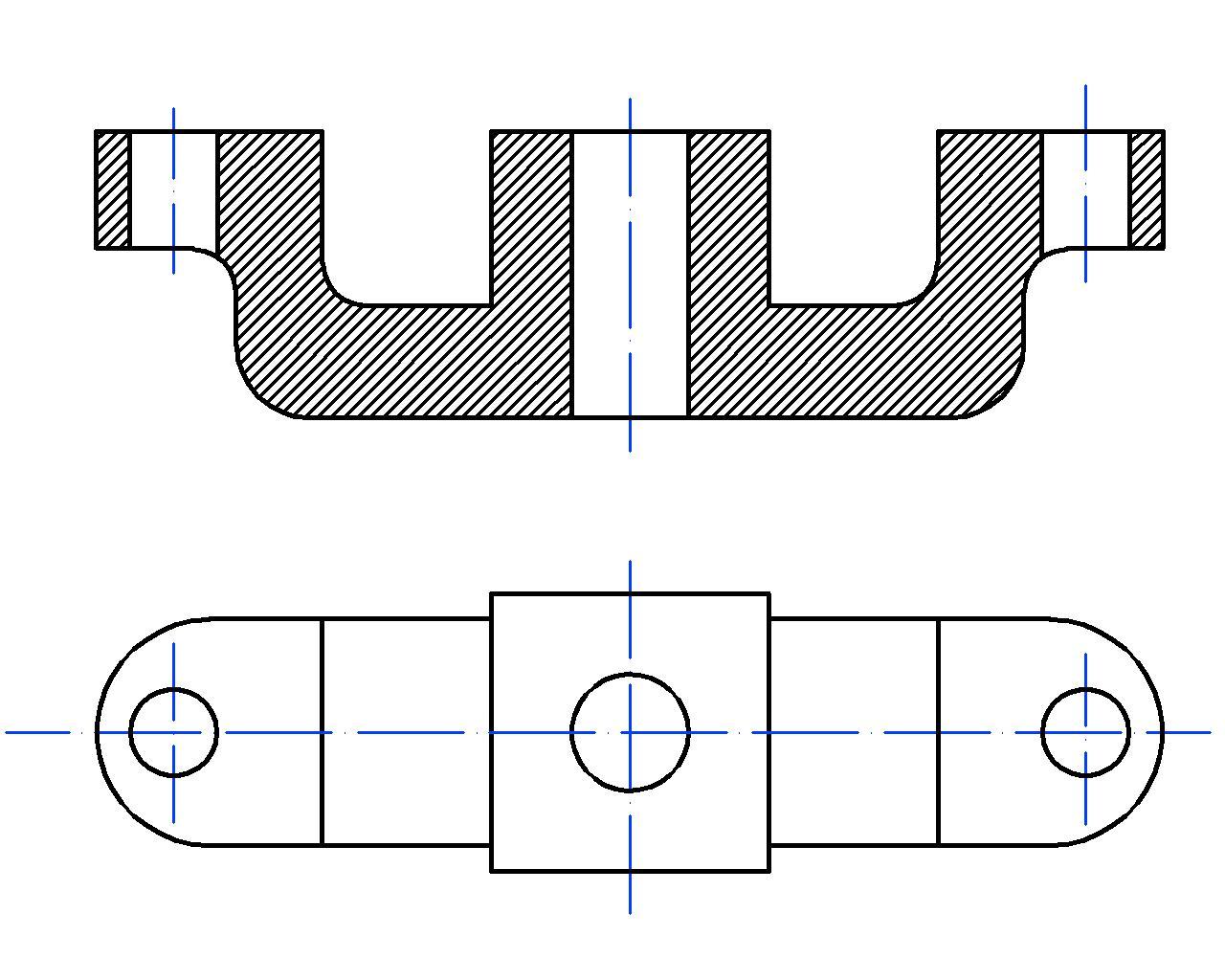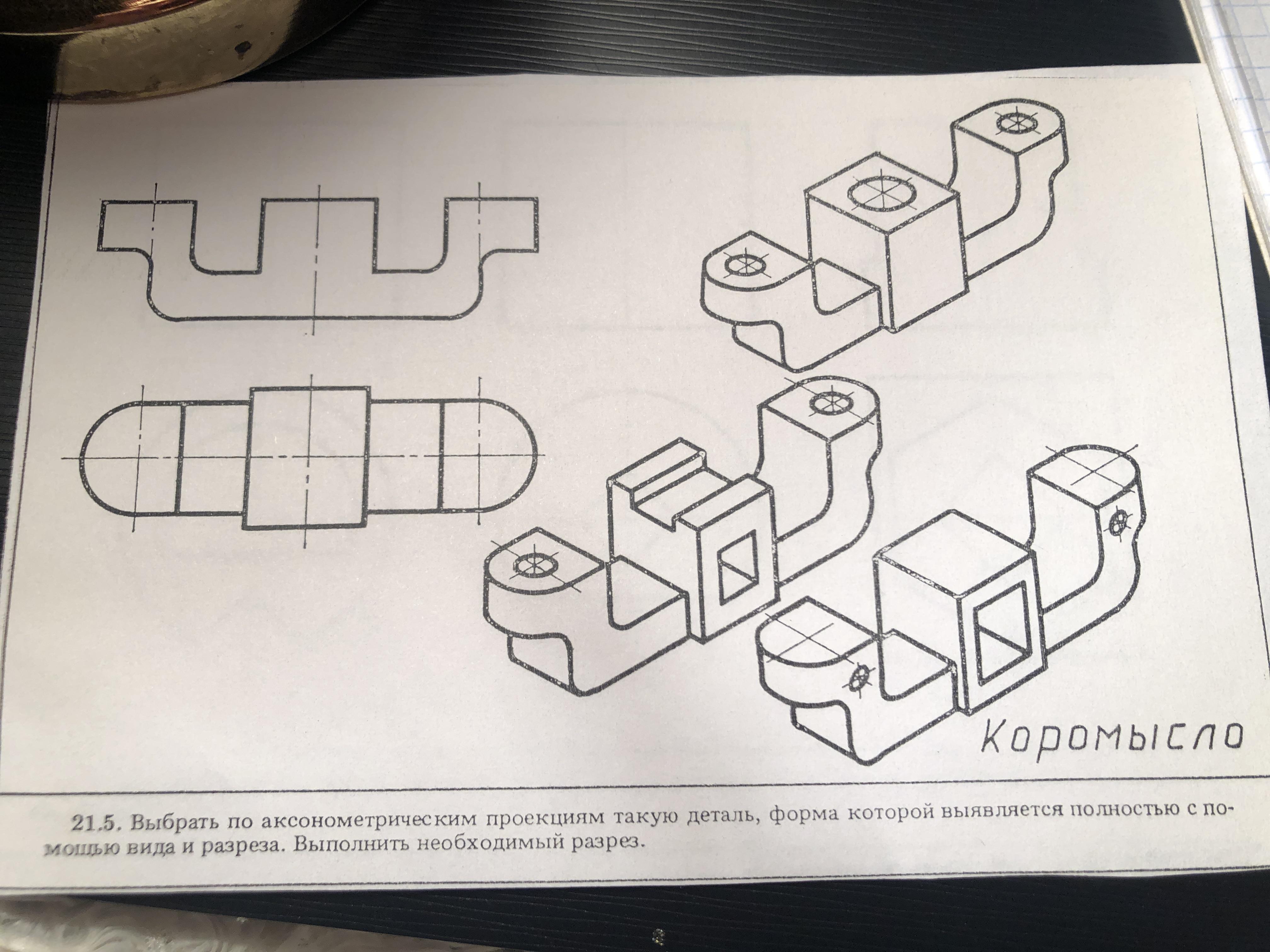 Выбрать по аксонометрическим проекциям такую деталь, форма которой выявляется полностью с помощью вида и разреза. Выполнить необходимый разрез. Помогите,пожалуйста !!! Вроде как это верхняя деталь