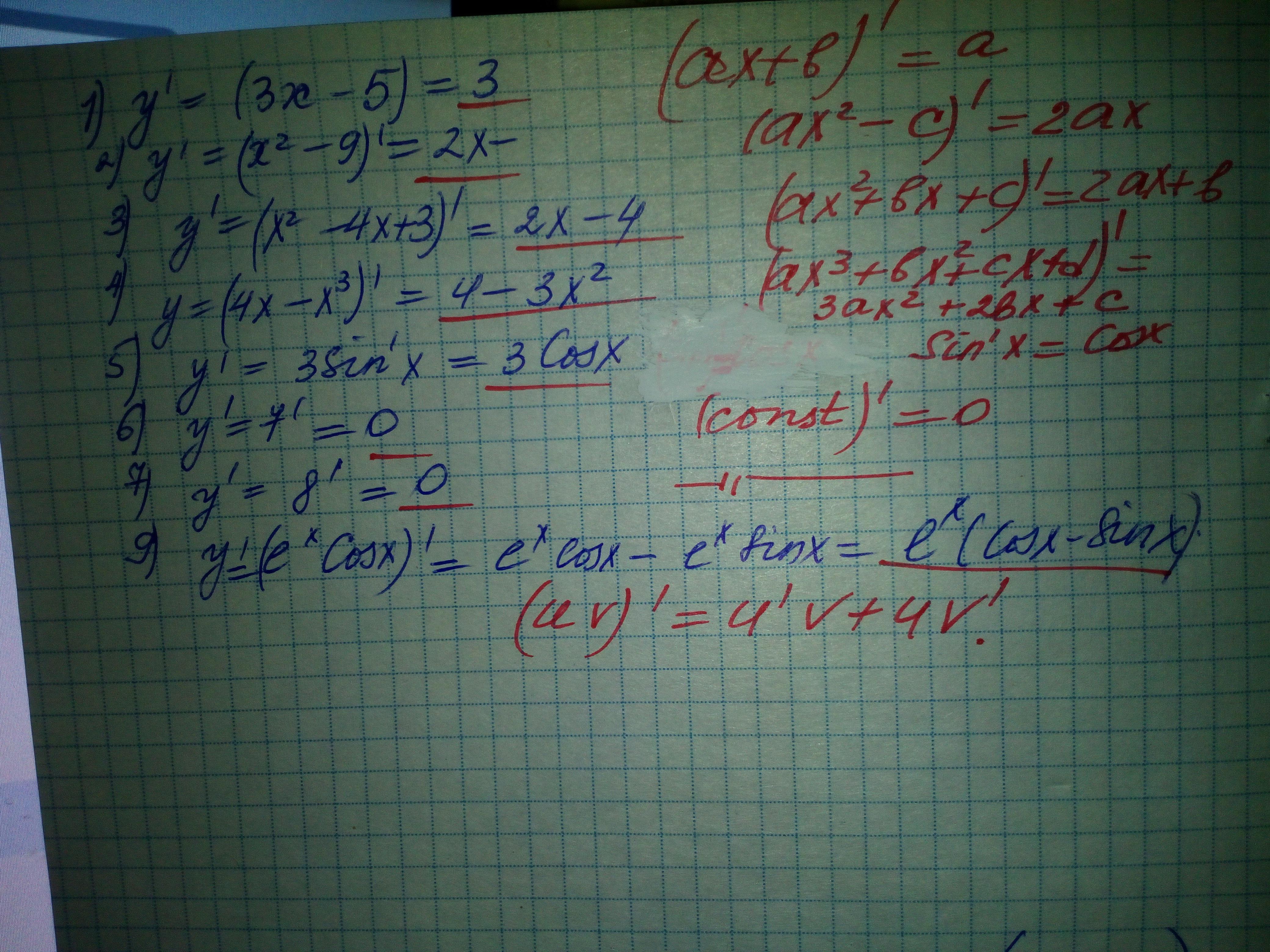 Найдите производную функции 1) y =3x-5 2) у=х^2-9 3) у=х^2-4х+3 4) у=4х-х^3 5) у=3sin х 6) у= 7) у= 8) у=e^х cos х
