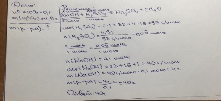 Рассчитайте массу раствора с массовой долей гидроксида натрия 10%, который потребуется для нейтрализации раствора, содержащего 4,9 грамм серной кислоты