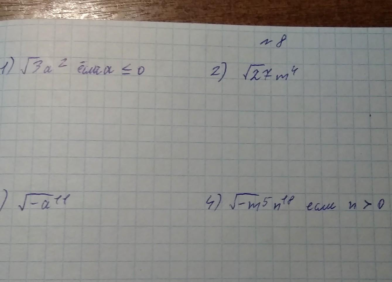 1) = -aV3, 2) =3m^2V3, 3) =a^5V-a, 4) =m^2n^9V-m , (V-корень)