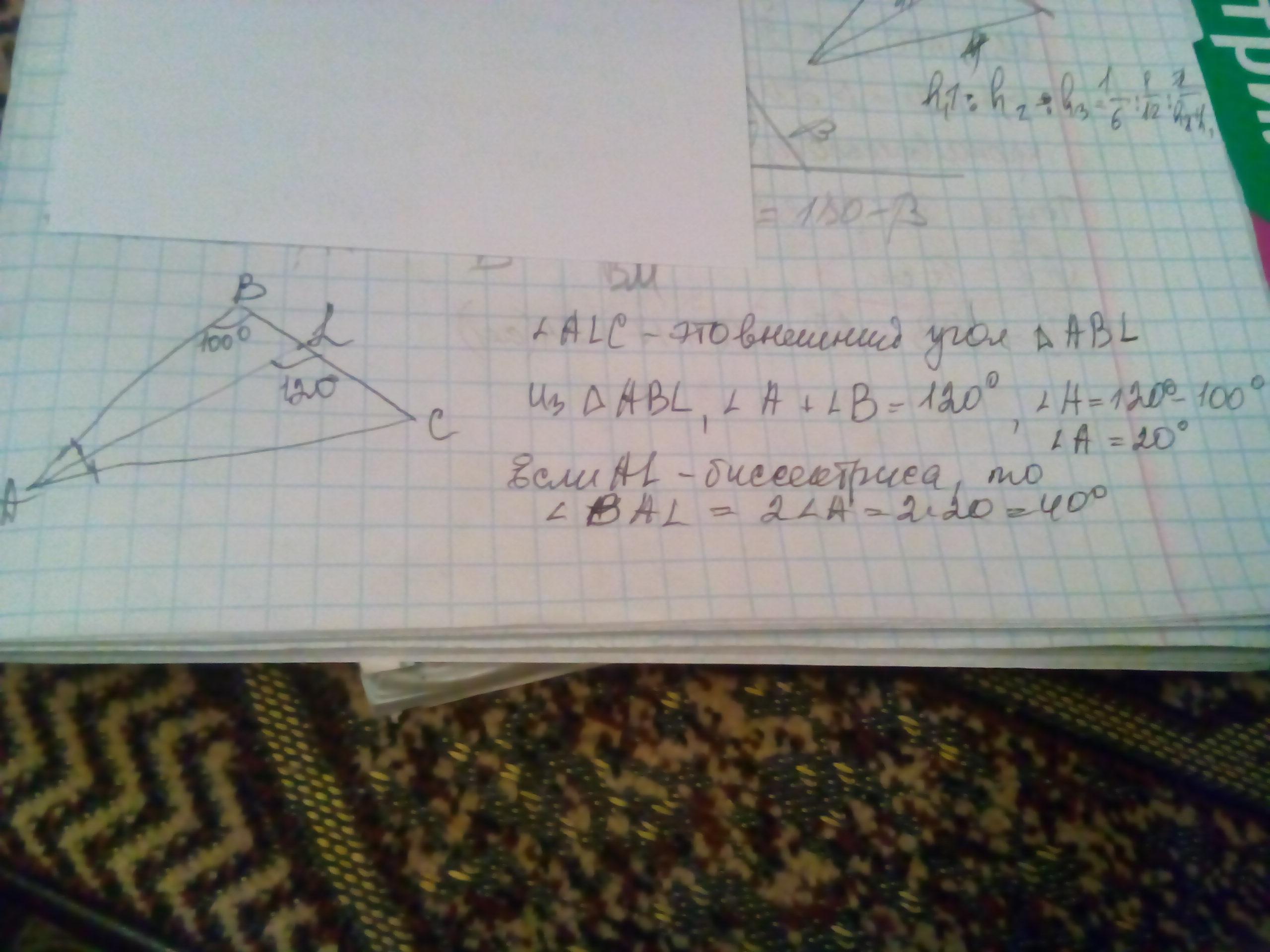 в треугольнике abc проведена биссектриса al . Угол abc равен 100 градусов , угол alc равен 120° . найдите угол bac