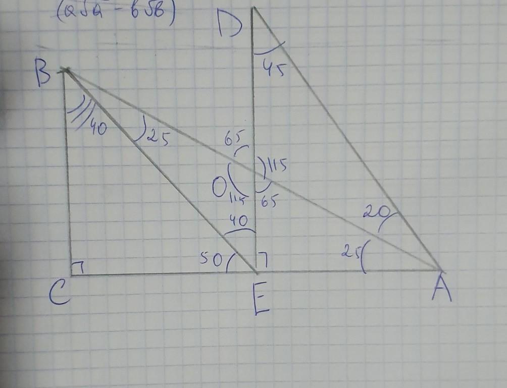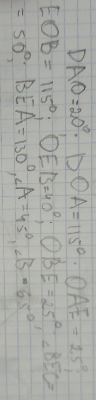 Основное свойство - сумма углов в каждом треугольнике равна 180 градусов. Также, стоит заметить, что углы расположенные возле точки O в сумме должны давать 360 градусов, а противолежащие эти углы равны.
