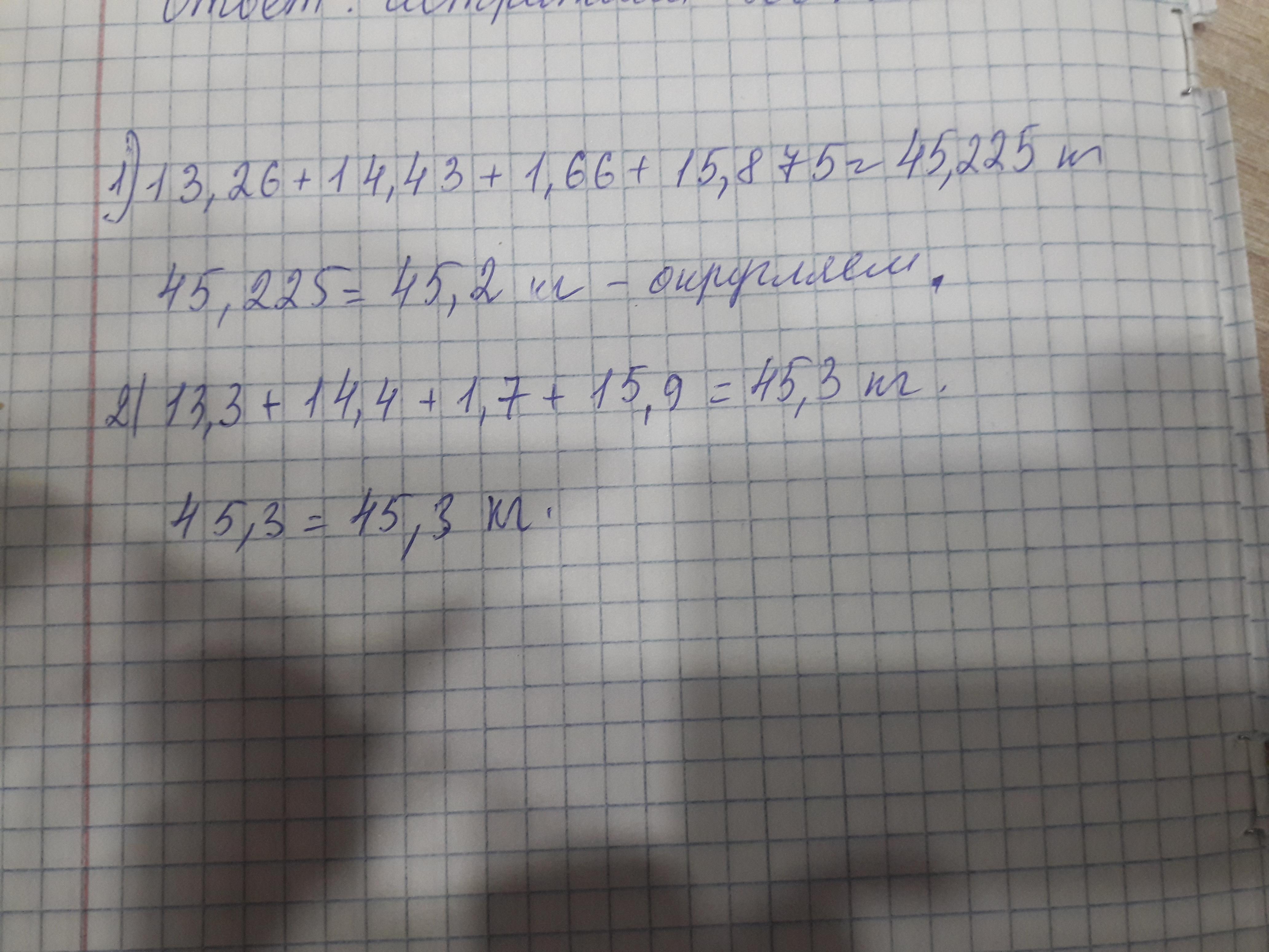 Одна деталь имеет массу 13,26 кг, вторая — 14,43 кг, третья — 1,66 кг, а четвёртая — 15,875 кг. Найдите общую массу этих четырёх деталей и округлите результат до десятых долей килограмма. Сравните ответ с результатом, полученным, если сначала округлить данные задачи до десятых долей, а потом её решить.