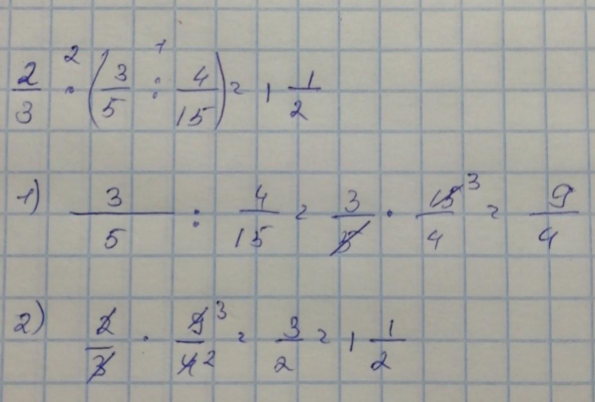 Значит:3/5*15/4 пять и пятнадцать можно сократить, по пять, получиться 3/1*3/4=9/4,а потом умножаем 2/3 на 9/4 их можно сократить 2 с 4 и 3 с 9=3/2*1/1=3/2