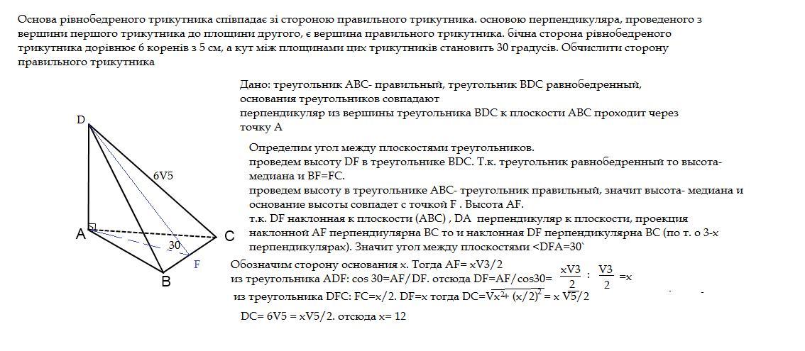 Основа рівнобедреного трикутника співпадає зі стороною правильного трикутника. основою перпендикуляра, проведеного з вершини першого трикутника до площини другого, є вершина правильного трикутника. бічна сторона рівнобедреного трикутника дорівнює 6 коренів з 5 см, а кут між площинами цих трикутників становить 30 градусів. Обчислити сторону правильного трикутника