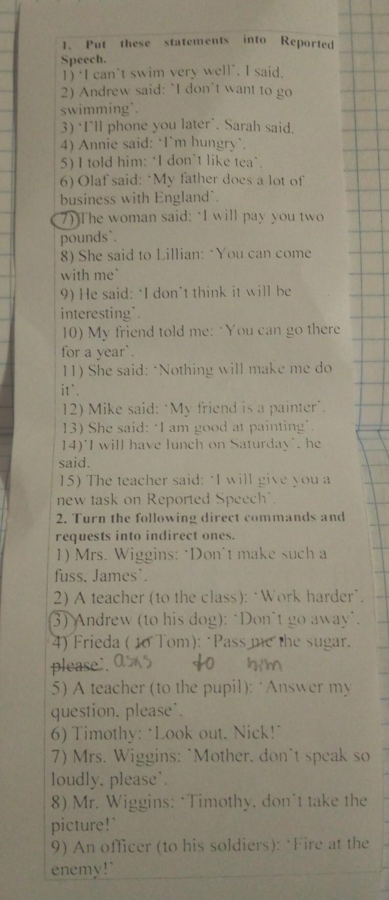 #2 Mrs.Wiggins told James not to make such a fuss. A teacher told the class to work harder.Andrew told his dog not to go away.Frieda asked Tom to pass her the sugar.A teacher told the pupil to answer her question.Timothy asked Nick to look out. Mrs Wiggins asked Mother not to speak so loudly. Mr Wiggins told Timothy not to take the picture. An officer asked his soldiers to fire at the enemy.