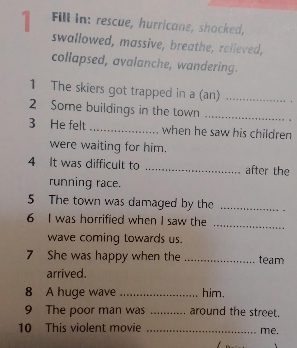 fill in: rescue, hurricane, shocked, swallowed, massive, breathe, relieved, collapsed, avalanche, wandering.
