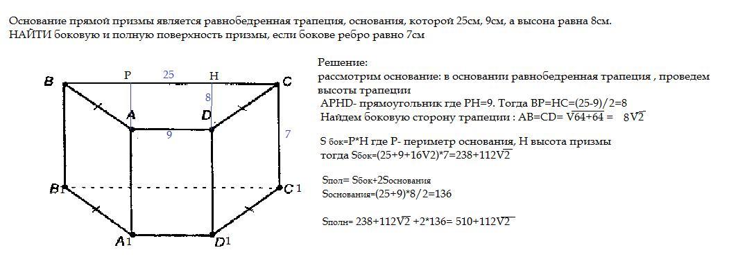 Основание прямой призмы является равнобедренная трапеция, основания, которой 25см, 9см, а высона равна 8см. НАЙТИ боковую и полную поверхность призмы, если бокове ребро равно 7см