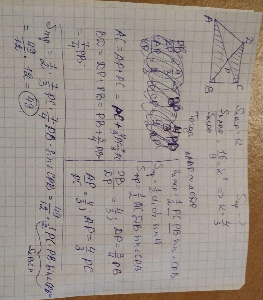 Трапеция прямоугольная. Площадь треугольника BCP = 12см. Соотношение площадей треугольников ABP/CDP = 16/9. Нужно найти площадь трапеции.