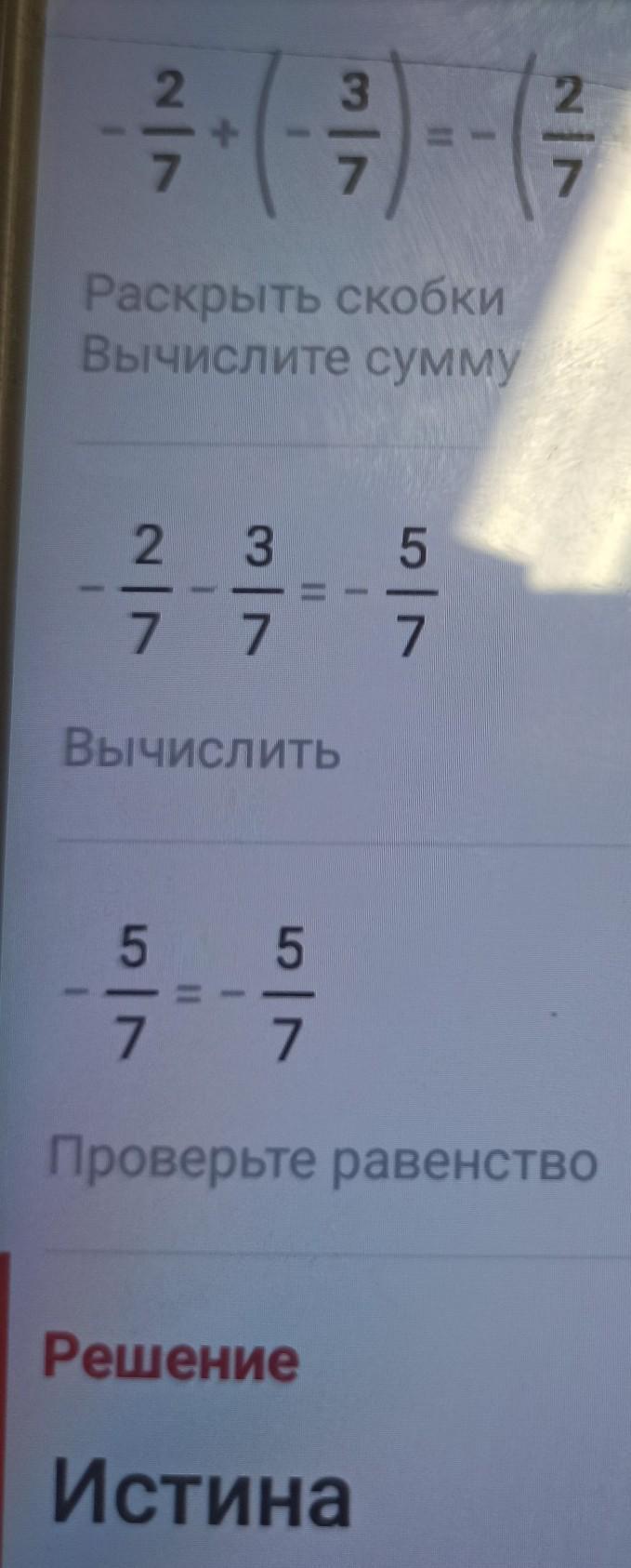 -2/7 + (-3/7) = -(2/7 + 3/7) = -((2+3)/7) = -5/7