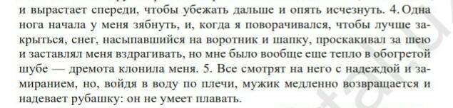 5.Все смотрят на него с надеждой и замиранием¹, но, войдя в воду по плечи, мужик медленно возвращается и надевает рубашку²: он не умеет плавать³.