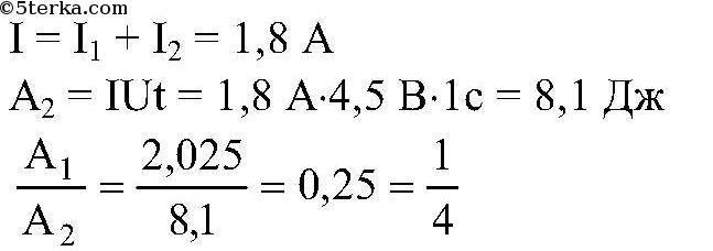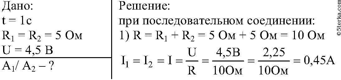 Два проводника, сопротивлением по 5 Ом каждый, соединены сначала последовательно, а потом параллельно и в обоих случаях включены под напряжение 4,5В. В каждом случае работа тока тока за одно и то же время будет больше во сколько раз?