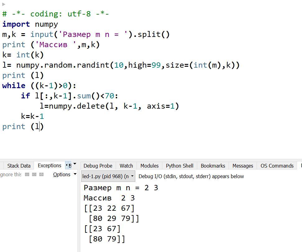 Задание для питона. Дан двумерный массив, заполненный случайными двухзначными числами,удалить все столбцы сумма элементов которых меньше 70. Прошу помогите(((