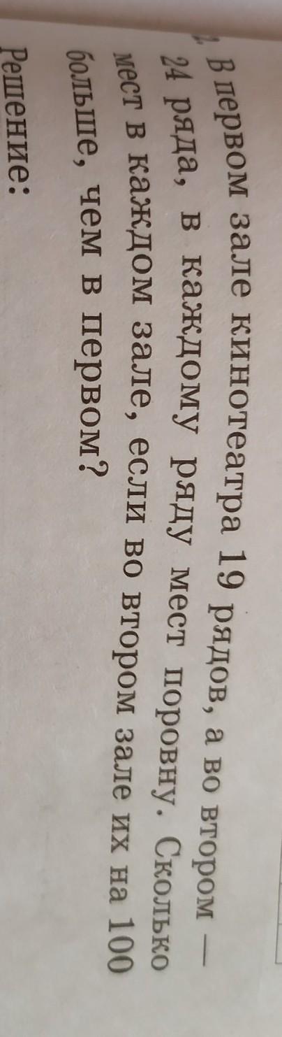 В первом зале кинотеатра 19 рядов, а во втором - 24 ряда, в каждому ряду мест поровну. Сколько мест в каждом зале, если во втором зале их на 100 больше, чем в первом. Даю баллов.