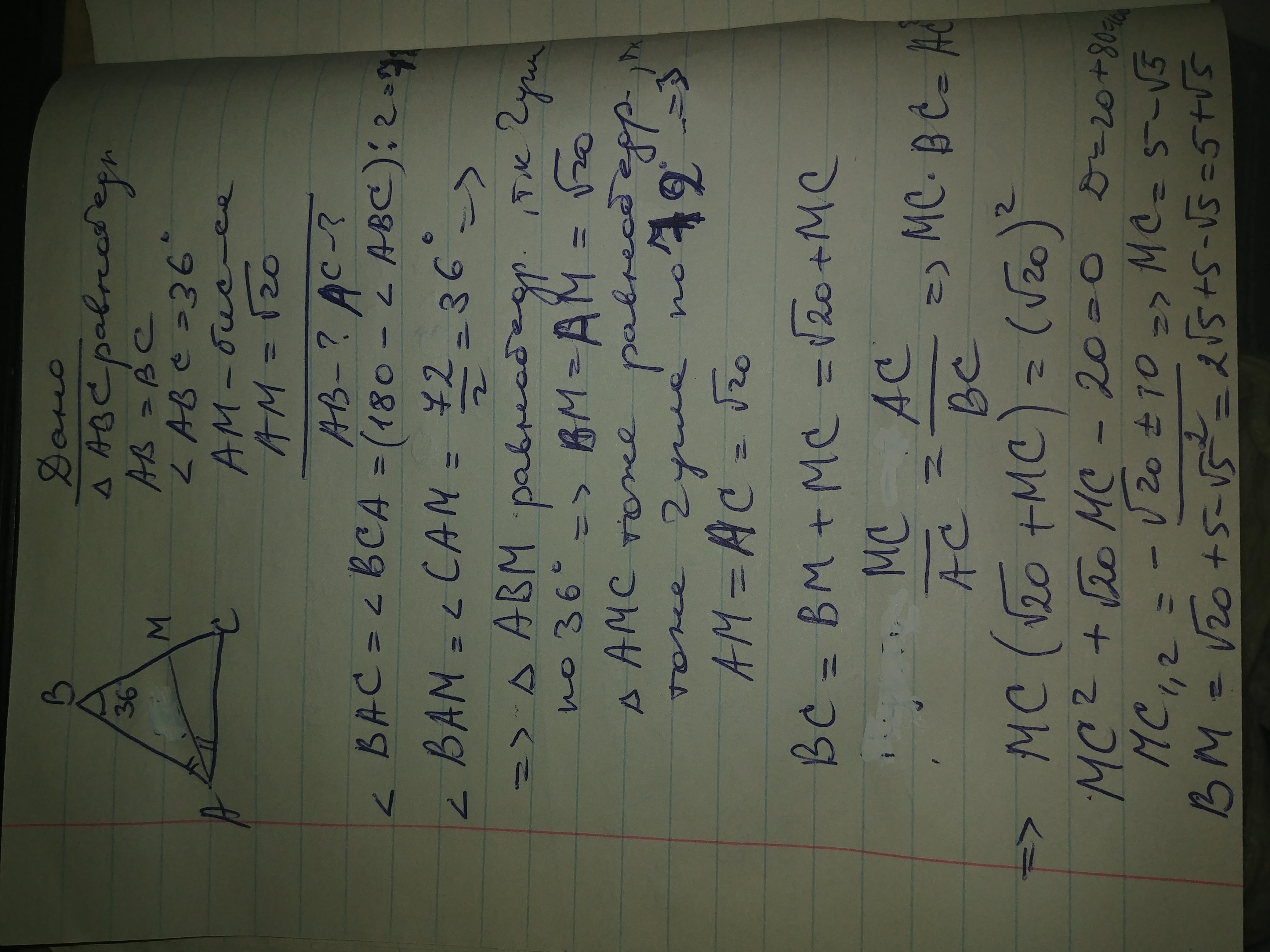 В равнобедренном треугольнике угол при вершине содержит 36 гр. , а биссектриса угла при основании равна √20. Найти длины сторон треугольника.