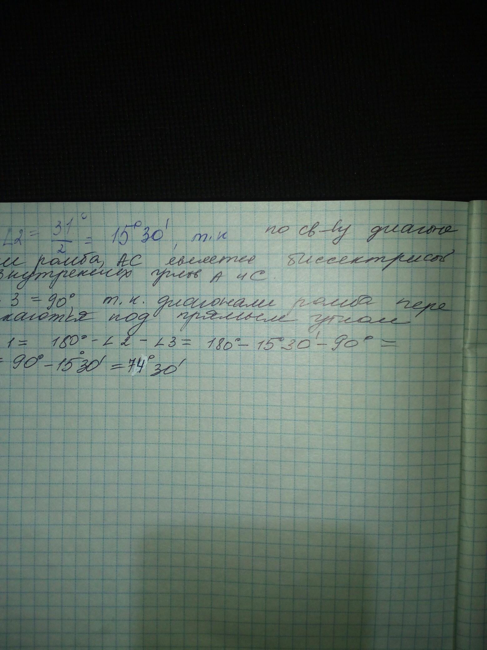Начнем с того что, диагональ ромба является бисектрисой. При этом помним что ромб, это тот же параллелограмм, то есть противолежащие углы равны: ∠A=∠C=31°.