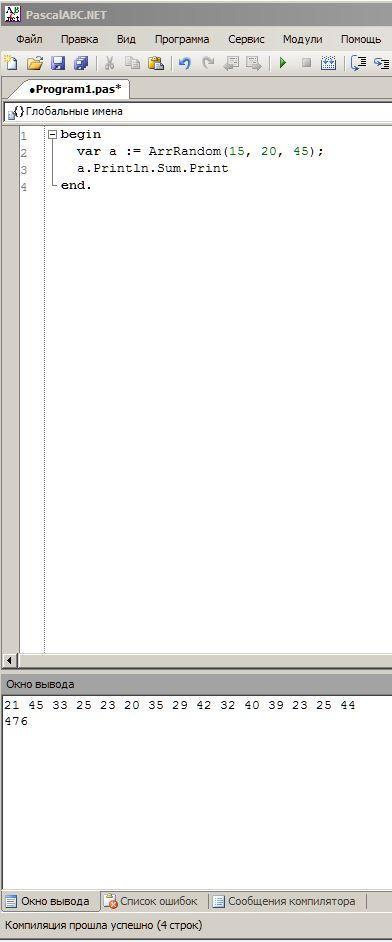 задайте одномерный массив, содержащий 15 элементов, взятых случайным образом из интервала [20,45]. Найдите и выведите сумму значений элементов массива.