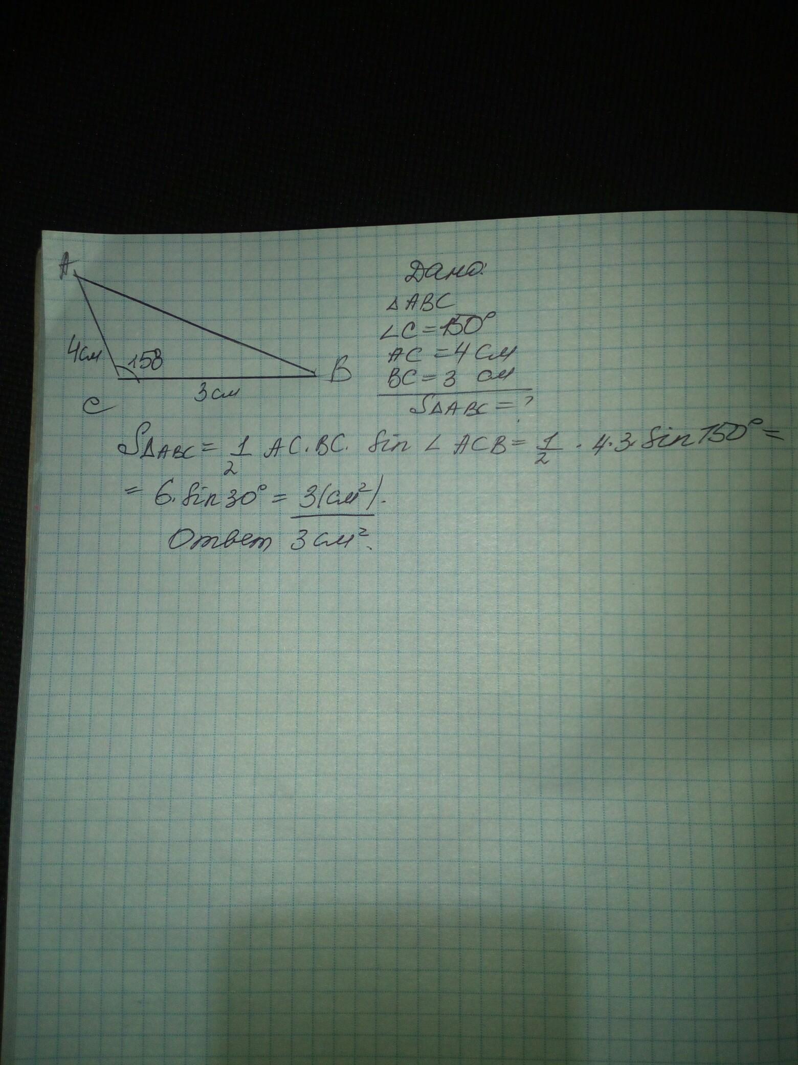 Две стороны треугольника равны 4 и 3 см, а угол между ними 150 градусов. Найти площадь этого треугольника