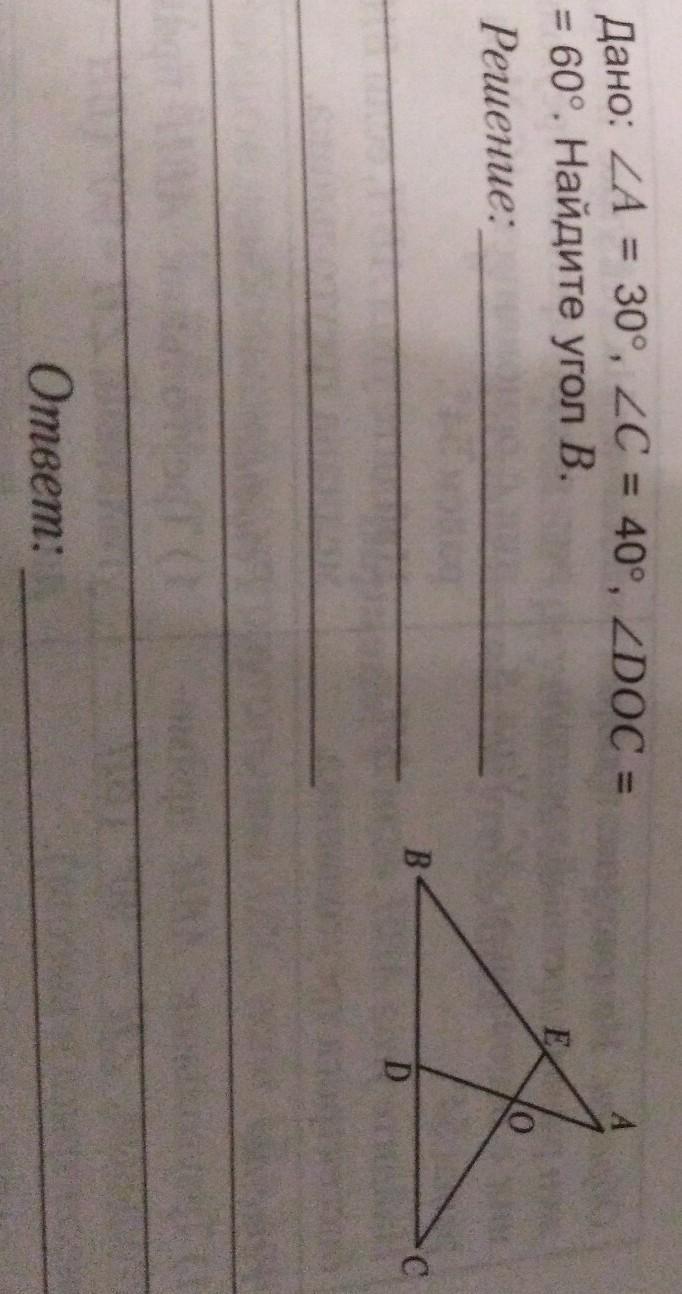 Смотрим на угол DOC и видим что у меня него есть аналогичный вертикальный угол EOA, который равен 60 градусов. Рассматриваем треугольник AOE, в нем А=30 градусов, О=60 градусов, Е=180-30-60=90 градусов. Угол BEO Равен 180-90=90 градусов. Теперь рассматриваем треугольник