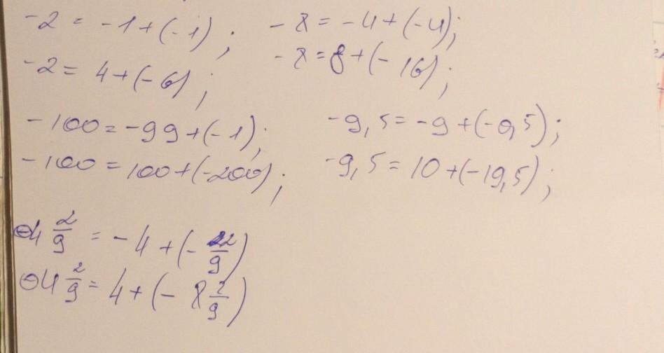 Запишите числами - 2; - 8; - 100; - 9,5; 4 2/9; в виде суммы двух отрицательных положительного и отрицательного чисел