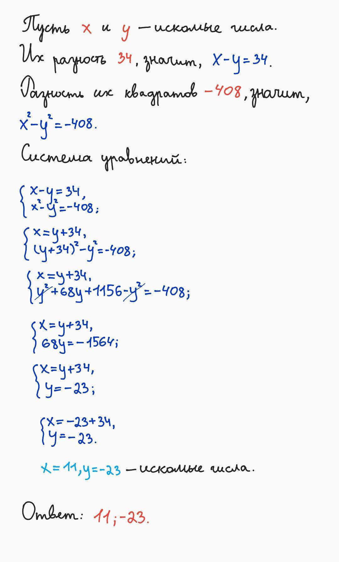 решите задачу с помощью составление уравнивания. Разность двух чисел равна 34, а разность их квадратов -408. Найдите эти числа.