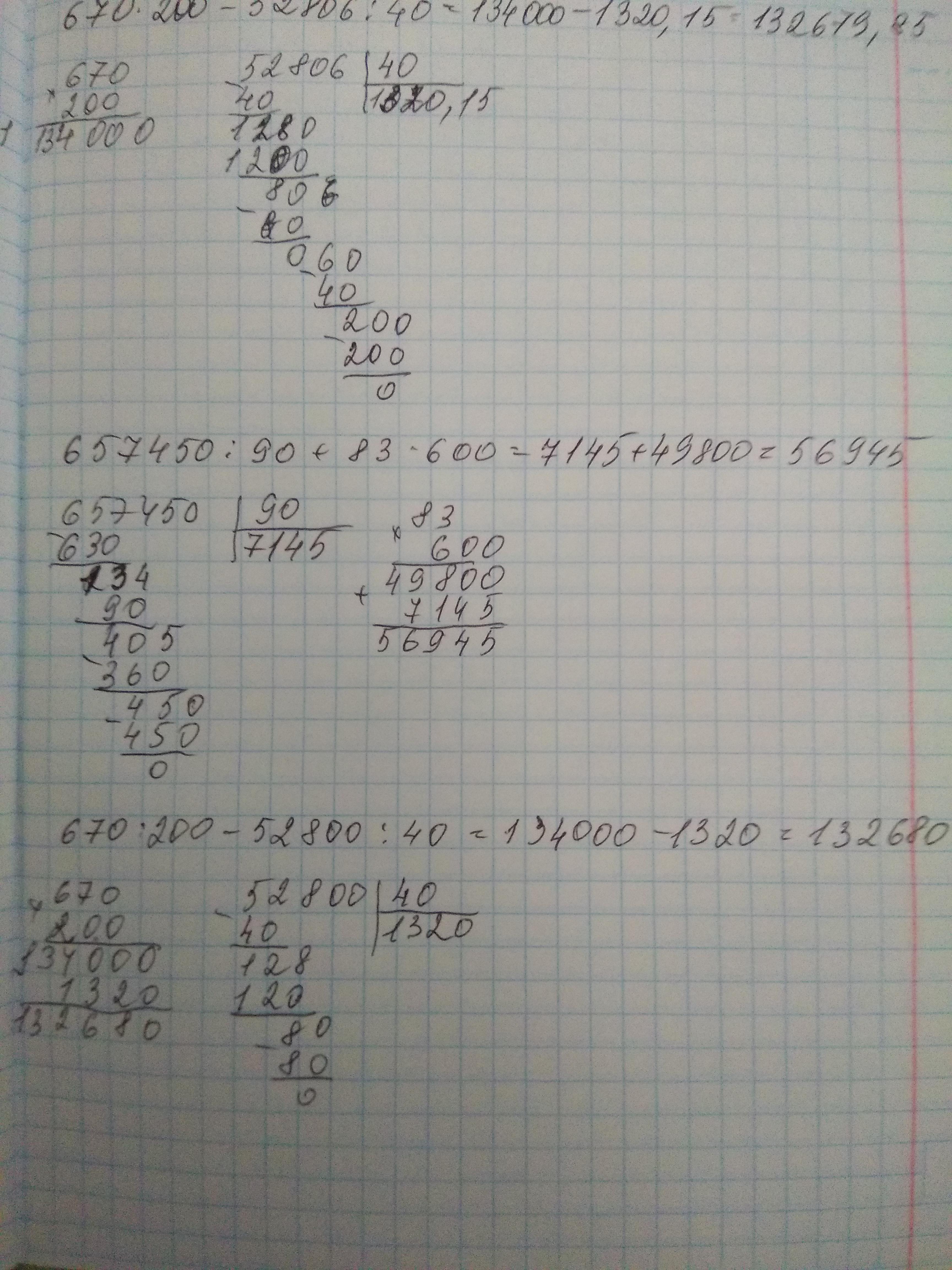 670 ×200=134000 ,52806÷40 =132015, 657450 =7305 , 83×600 =49800 ,134000‐132015= 1985 , 7305 +49800= 57105