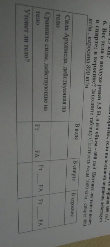 Fa в спирте=900*10*400*10^-6= 3.6 Н