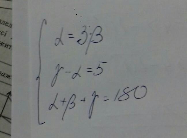 Найди углы треугольника если один угол из углов в три раза больше другого и на 5 градусов меньше третьего