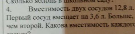 Пусть вместимость первого сосуда - х, тогда вместимость второго x-3,6. Составим уравнение