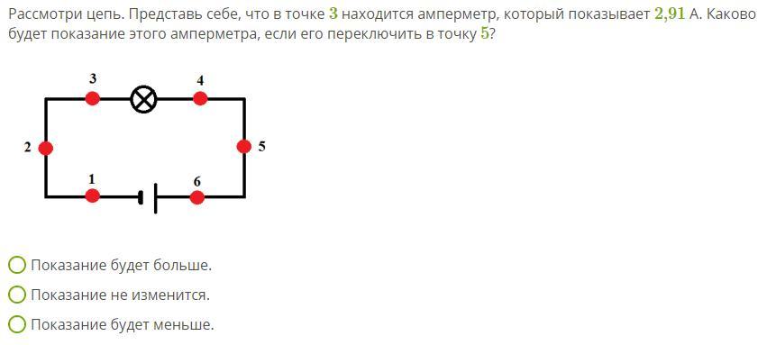 Рассмотри цепь. Представь себе, что в точке 3 находится амперметр, который показывает 2,91 А. Каково будет показание этого амперметра, если его переключить в точку 5?