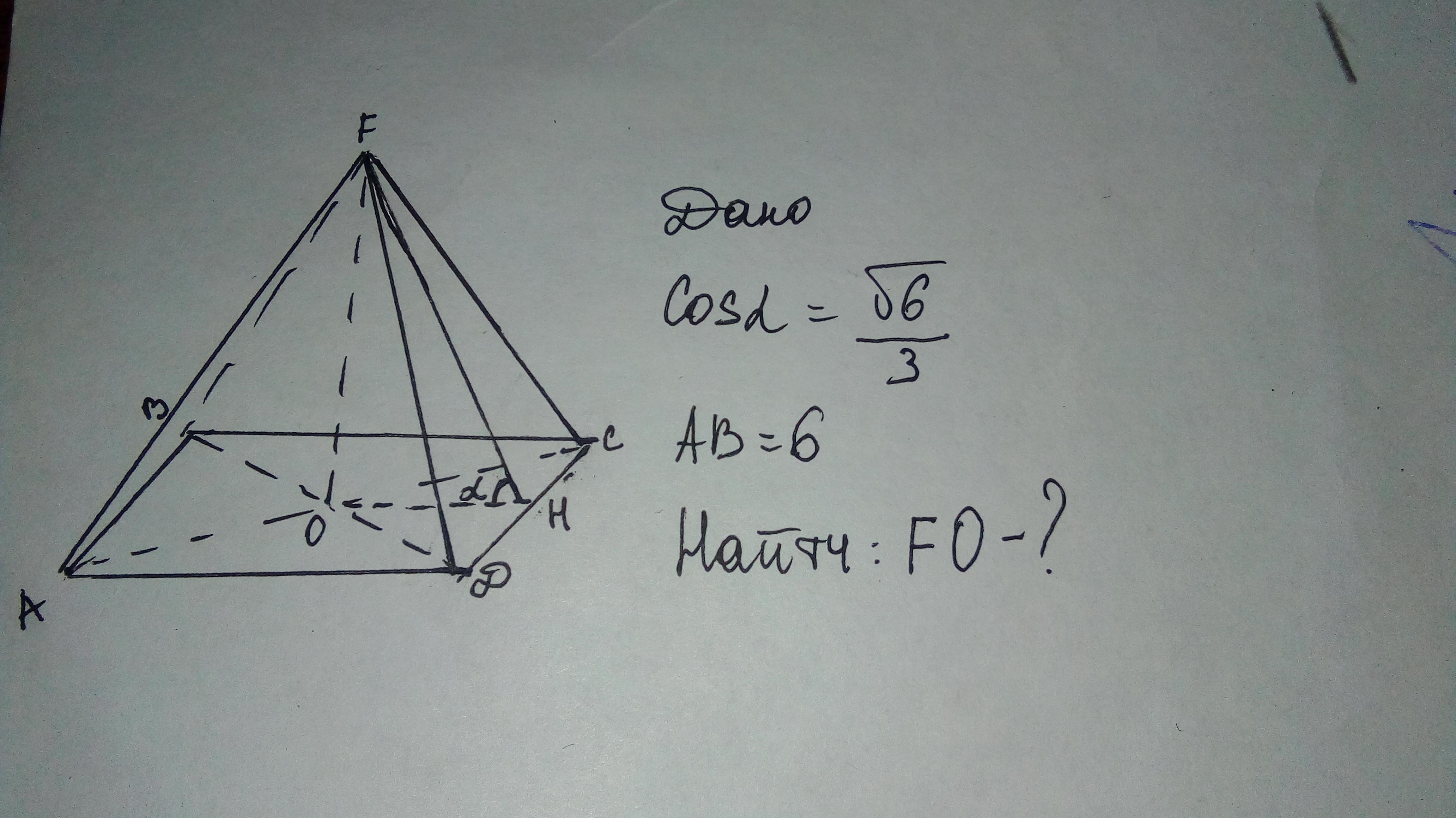 дана правильная пирамида, сторона основания равна 6, а косинус угла а, найти fo-?