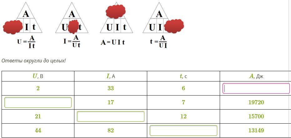 Используй информацию и заполни таблицу! Работа электрического тока на участке цепи равна произведению напряжения на концах этого участка на силу тока и на время, в течение которого совершалась работа:
