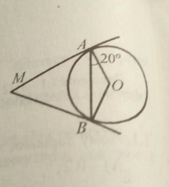 Дано: коло (О; R), МL і MB - дотичні, т. A i В - точки дотику, ∠OAB = 20°.