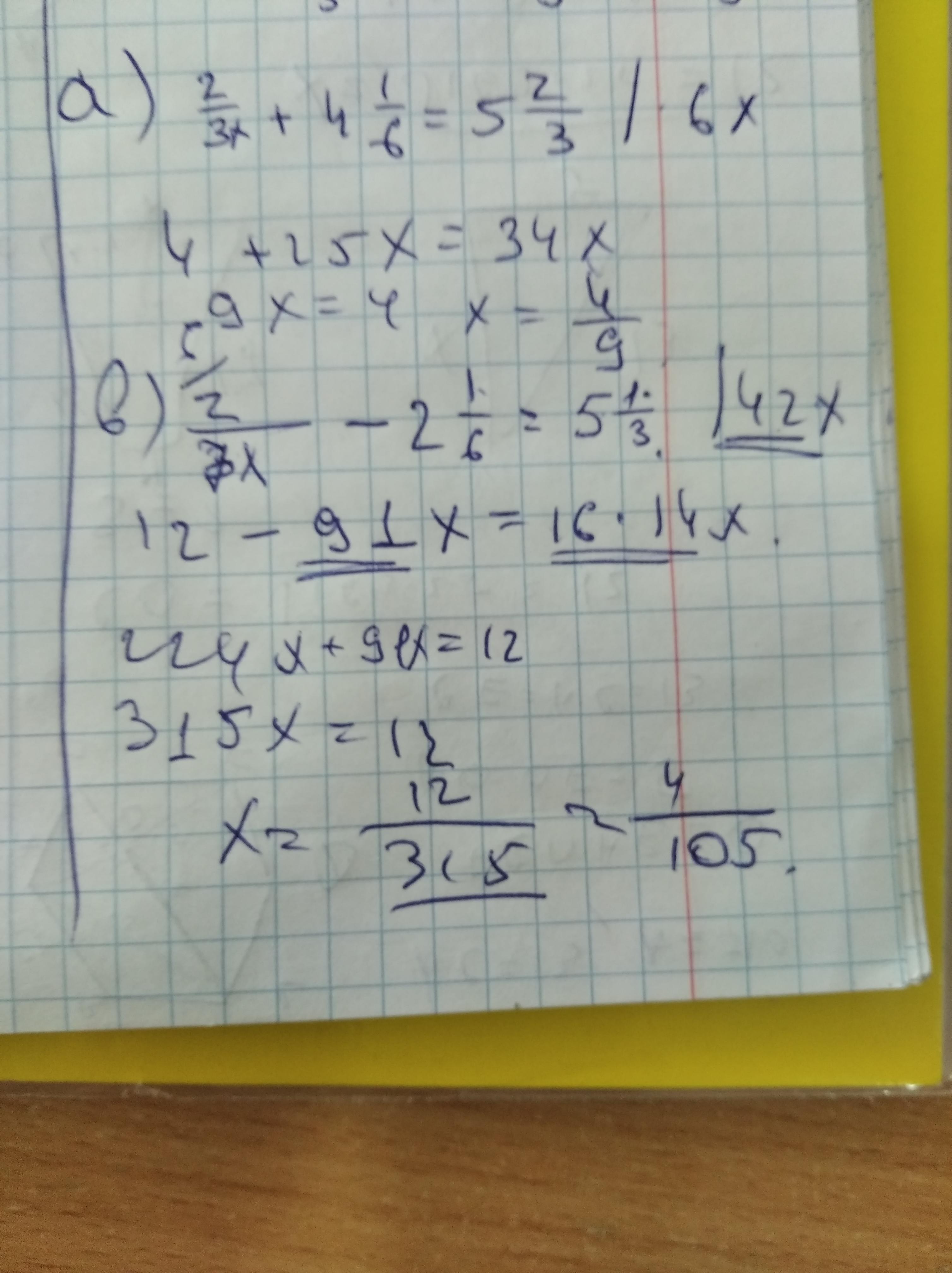б) 2/3 ·x+4 1/6=5 2/3; 2/3 ·x=5 4/6 -4 1/6; x=1 1/2 ·3/2=3/2 ·3/2=9/4=2,25