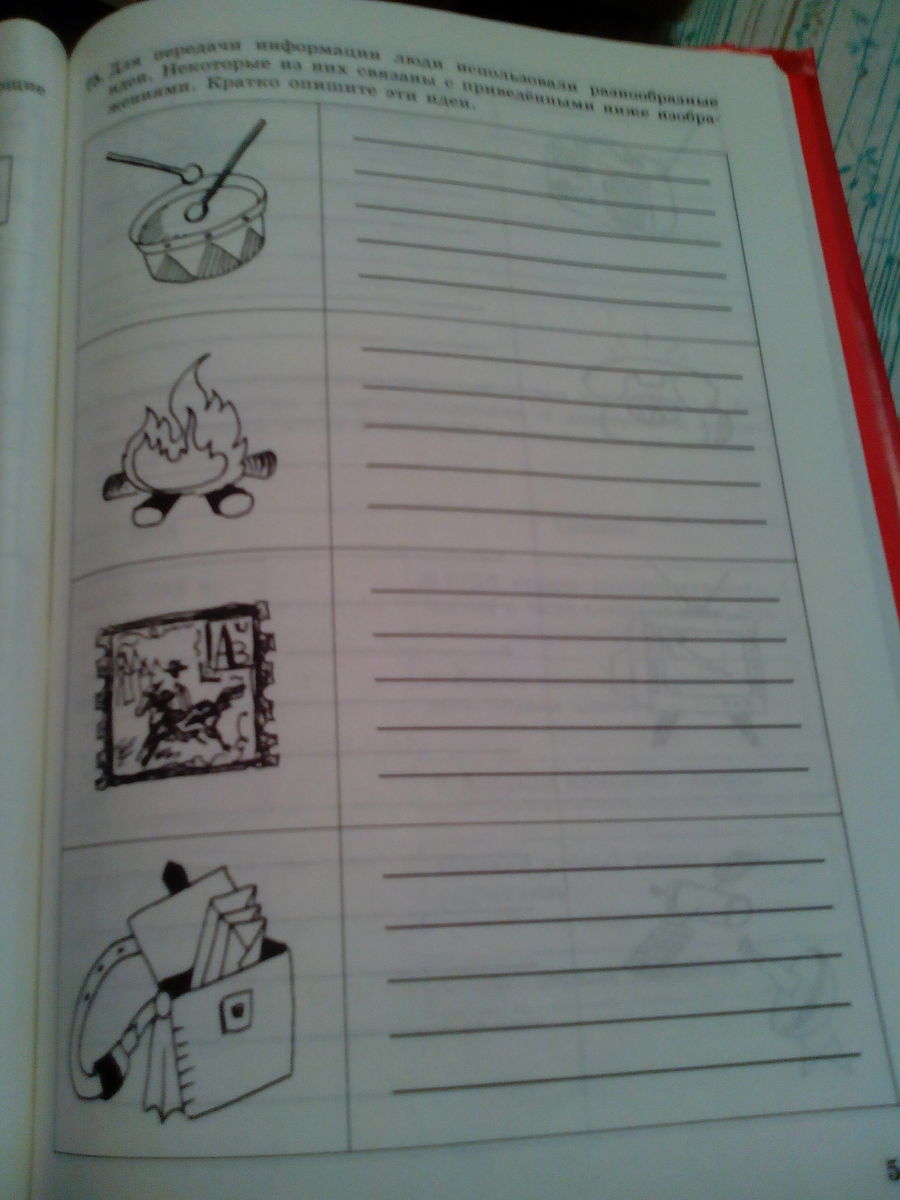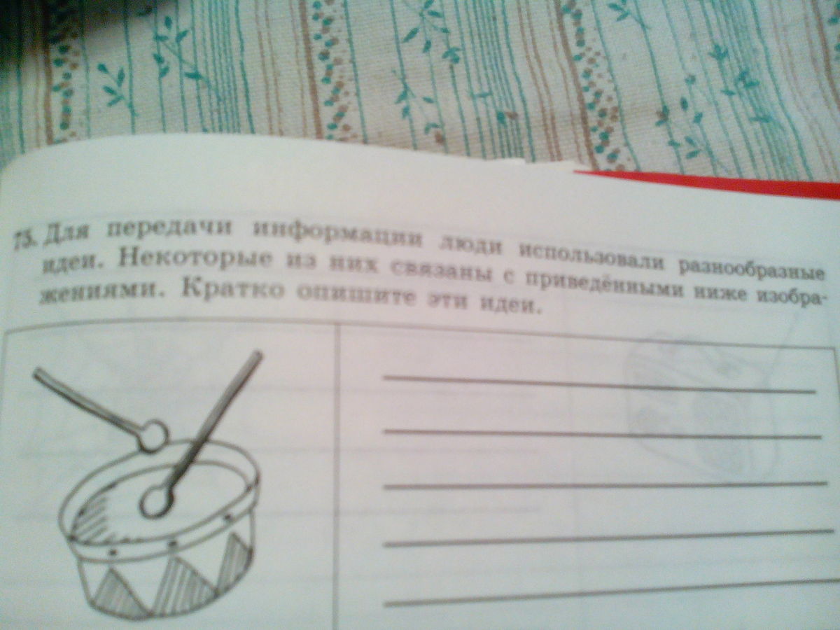 №1 1)раньше когда не было телефонов,радиоприёмников и т.д, то люди выходили на центральную площадь и барабанили, чтобы оповестить других о приказе царя ит.д 2)в древности люди разжигали костры, дым от которых был виден за сотни километров.Они служили визуальными сигналами,оповещали чем-то,например об опасности. 3) я незнаю!! 4)Это атрибутика почтальона,разносящего письма. №2 по радио можно слушать музыку и различную информацию.2)По телефону мы общаемся слышим друг друга но не видим,мы можем рассказать друг другу события что случилось в мире и многое другое.3) по телевизору мы можем видеть и слышать информацию которая творится в мирев стране(политика,спорт,новости ит.д)4)спутниковая передача информации через воздушное пространство.5)я тоже не знаю .