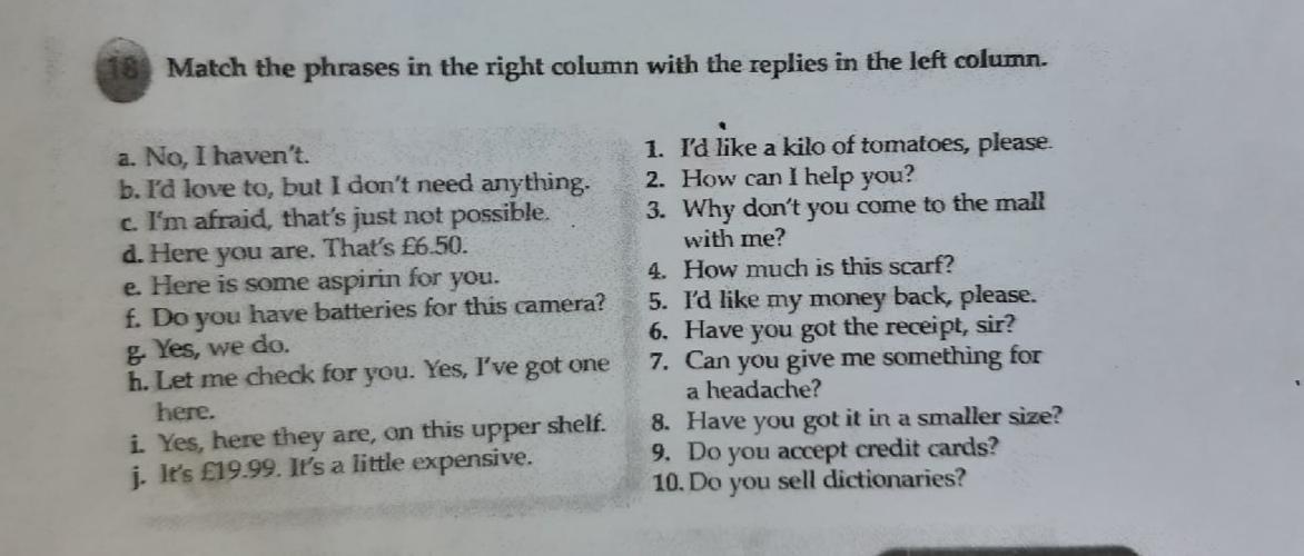 5. I'd like my money back, please. c. I'm afraid, that's just not possible.