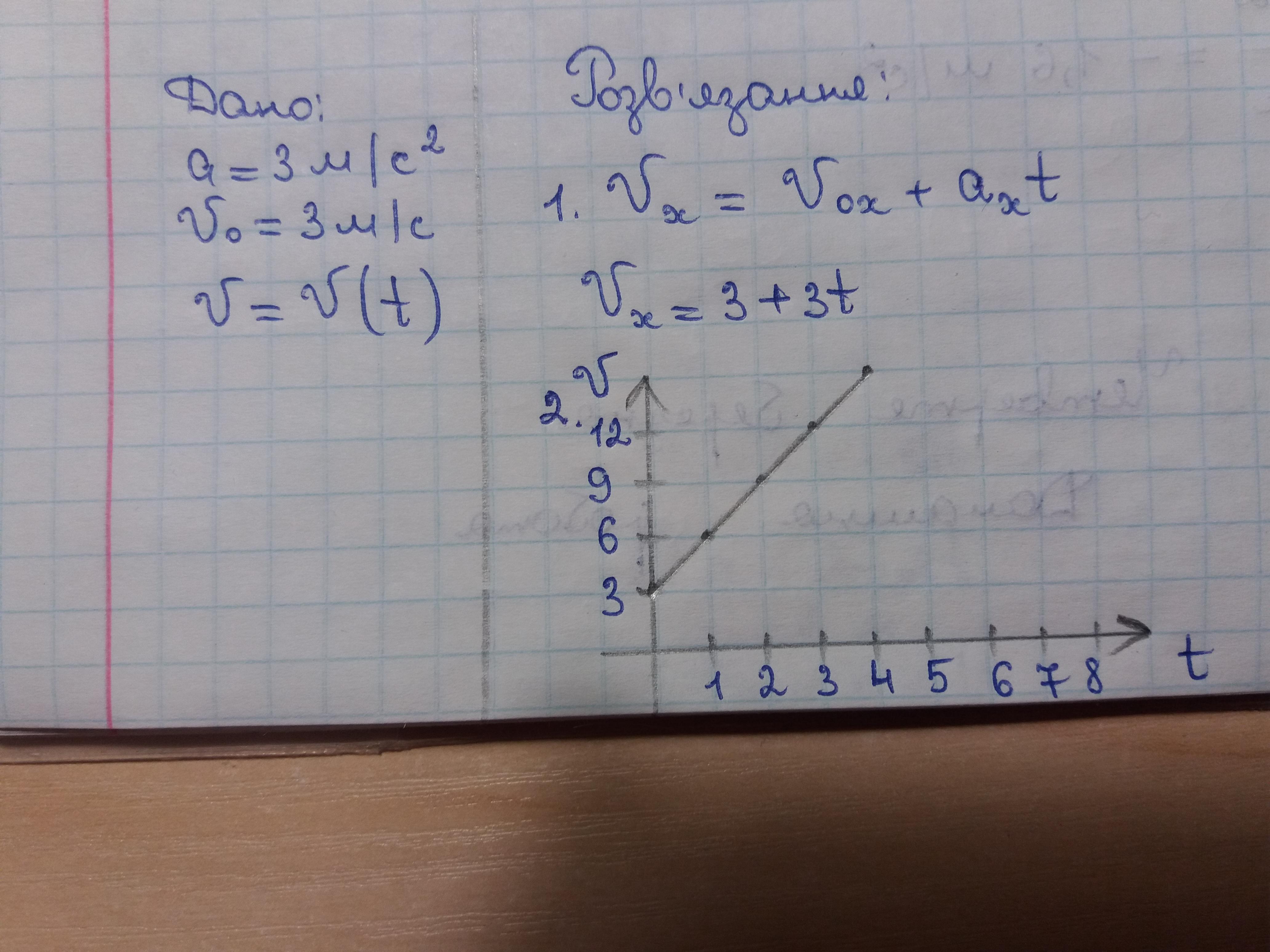 Тіло рухається прямолінійно й Тіло рухається прямолінійно й рівноприскорено (а=3 м/с). Запишіть рівняння v= v (t) і побудуйте графік цієї функції,якщо початкова швидкість тіла vo= 3 м/с