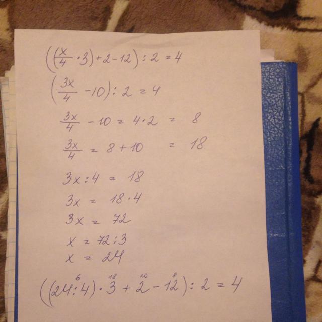 Магомед показывает фокусы с числами. Динара загадала число, поделила его на 4, умножила на 3,прибавила 2,вычла 12,разделила на 2,и получила четыре. Магомед тут же сказал какое число загадала Динара. Какое ?