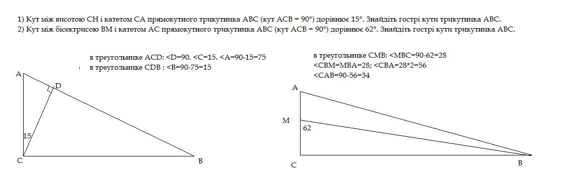 2) Кут між бісектрисою BM і катетом АС прямокутного трикутника ABC (кут ACB = 90°) дорівнює 62°. Знайдіть гострі кути трикутника ABC.